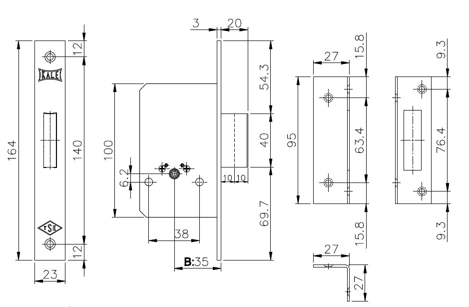Замок врезной, крестообразный Kale-kilit 157 F (35 мм), 3 ключа, цвет никель.