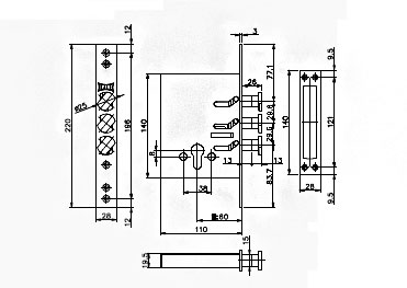 Врезной цилиндровый замок для металлических дверей Kale-kilit 287 D (60 мм). С поворотными ригелями, с подшипником. Цвет: хром. Цвет цилиндра-золотой.
